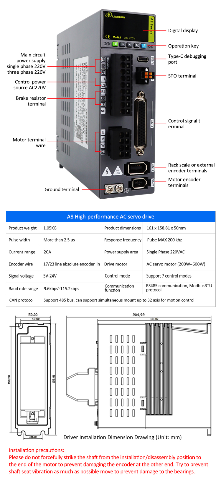 Siri iki minangka servo drive ac dhuwur kanthi fungsi simpen (sing aman) kanthi standar safety torsi, sing cocog karo standar safety safety torsi, sing tundhuk standar safety safety, sing cocog karo standar safety safety lan bisa nggayuh standar aman lan bisa nggayuh mati sing aman ing kasus darurat. Sistem ndhukung mode kontrol lengkap-gelung lengkap, lan entuk akurasi posisi ± siji pulsa liwat umpan balik enak resolusi dhuwur, sing kompatibel karo skenario aplikasi motor lan scenario aplikasi motor. Iki dilengkapi antarmuka debugging jinis-C, ndhukung konfigurasi parameter wektu nyata, lan duwe antarmuka parameter RS485 sing dibangun (protokol modbus rtu), lan tingkat baud bisa diatur saka 9.6kbps ~ 115.2kbps. Iki nganggo algoritma kontrol orientasi magnetik (FOC), sing cocog kanggo kesempatan tanggapan sing apik banget kayata peralatan tliti CNC lan semikonduktor.